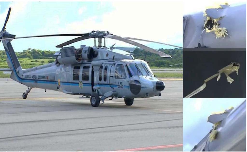 Acima imagens do helicóptero da Fuerza Aerea Colombia (FAC), mostrando vários impactos de armas leves possivelmente AK-47. Caso fosse uma aeronave civil teria sido derrubada no atentado, no dia 25 Junho 2021, próximo à fronteira com a Venezuela. Caso fosse um MANPADS (IGLA ou similar), as chances seriam zero. FOTOS – Fuerza Aerea Colombia