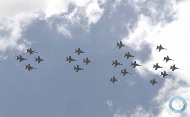 A chegada à base foi marcada pelos novos aviões juntando-se a outros 16 Super Hornets para um emocionante vôo de 20 jatos em formação.
