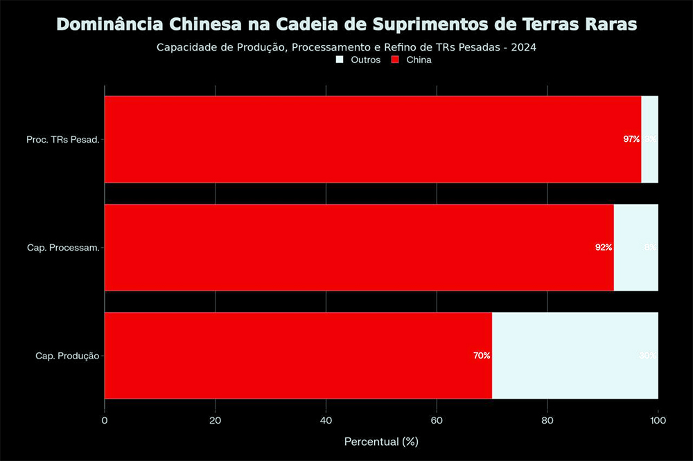 • Especialização: Para 85-99% dos elementos específicos de terras raras pesadas, a China detém entre 95-100% da capacidade de processamento.