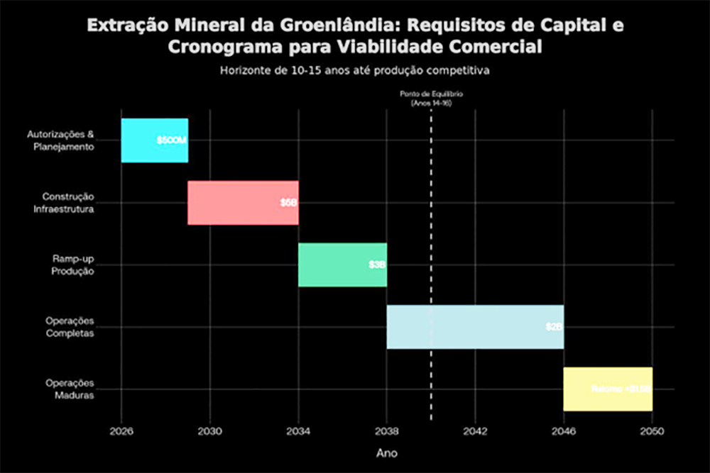 Isto implica que qualquer aquisição de Groenlândia em 2026 produziria retorno comercial significativo apenas em 2036-2040, horizonte que transcende expectativas políticas de campanhas eleitorais (4 anos).