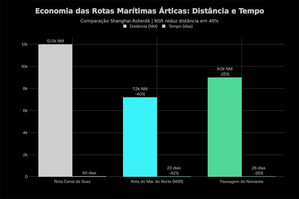1. Rota do Mar do Norte (Northern Sea RouteNSR): Contorna costa russa, conectando Europa ao Oceano Pacífico em arco extremamente setentrional. Viagem de navios-contêiner da Coreia do Sul a Roterdã reduz-se de 34 – 40 dias via Canal de Suez para 23 dias via NSR — redução de 40% em tempo de navegação.