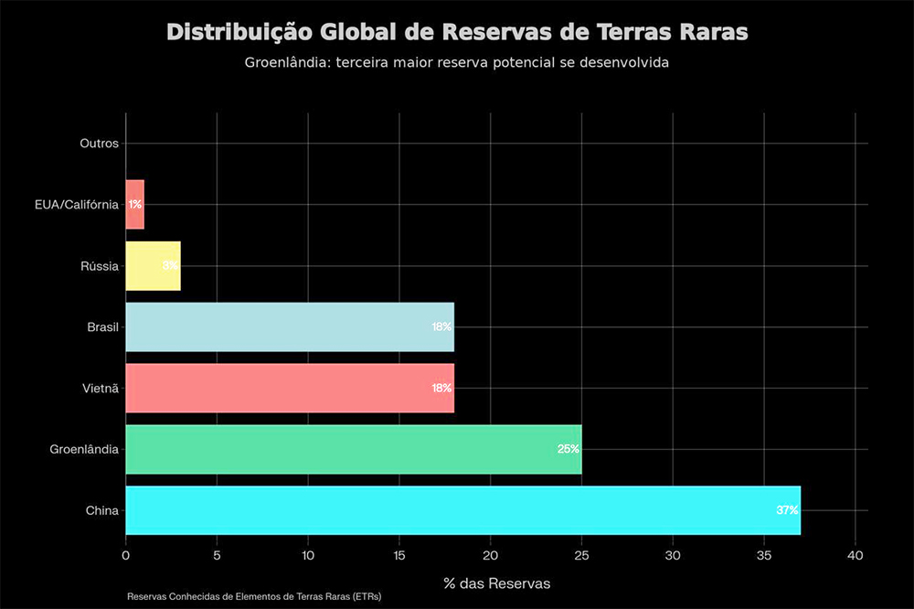 O Serviço Geológico da Dinamarca e Groenlândia (GEUS) mapeou na Groenlândia uma concentração de 36,1 a 38,5 milhões de toneladas de terras raras, correspondendo aproximadamente a 25% das reservas mundiais conhecidas. Este dado é particularmente significativo quando contextualizado na geografia global de terras raras: a maior parte das reservas concentra-se em China (37%), Vietnã (18%), Brasil (18%), Rússia (3%) e Califórnia (1%)[8], tornando Groenlândia terceiro repositório potencial se desenvolvido em escala comercial.