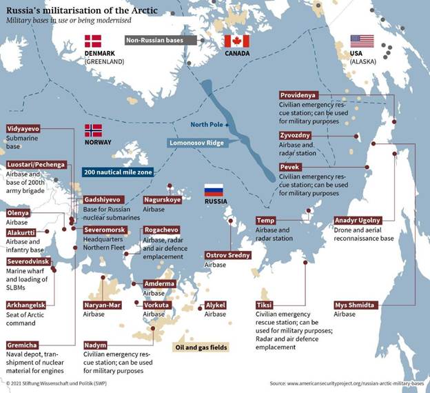 Putin reafirmou em março de 2025 que a Rússia aumentará sua presença militar no Ártico, citando necessidade de defender “interesses nacionais” contra atividades da OTAN na região. Investimentos russos em bases militares, navios quebra-gelos nucleares, capacidades de defesa costeira e infraestrutura de energia incluem-se em plano de 300 bilhões USD em 15 anos.