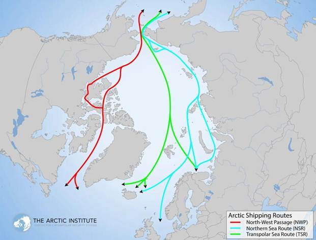 O degelo acelerado da calota polar ártica constitui fenômeno geofísico com implicações geopolíticas transformacionais. Dados do National Snow and Ice Data Center (NSIDC) documentam perda de 3,9 trilhões de toneladas de gelo groenlandês entre 1992 e 2018, com taxa de aceleração. Projeções de modelos climáticos indicam que a Rota do Mar do Norte (ao longo da costa russa) poderá ser navegável durante meses inteiros dentro de 20 anos, em comparação aos poucos meses de navegação viável atualmente.