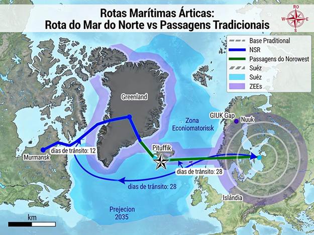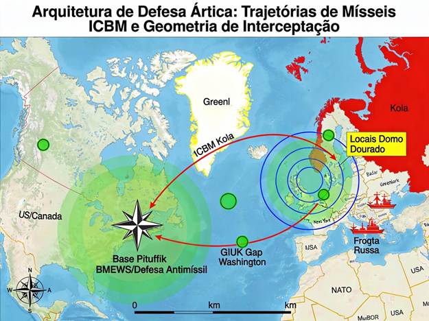 A base militar americana Pituffik (anteriormente denominada Thule), localizada no noroeste da Groenlândia a 76,5°N de latitude, constitui instalação militar mais setentrional dos EUA [23]. Sua importância estratégica decorre de geometria específica da guerra nuclear: a rota geodésica mais curta para um míssil balístico intercontinental (ICBM) russo atingir o território continental americano passa exatamente sobre a Groenlândia, Ártico canadense e Polo Norte.