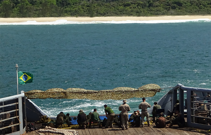 Figura 3 – “Operadores Especiais da Marinha, Exército e Aeronáutica a bordo do NApOc “Purus” realizando disparos do mar sobre alvos na Ponta do Varejo do CADIM a cerca de 530 metros de distância”