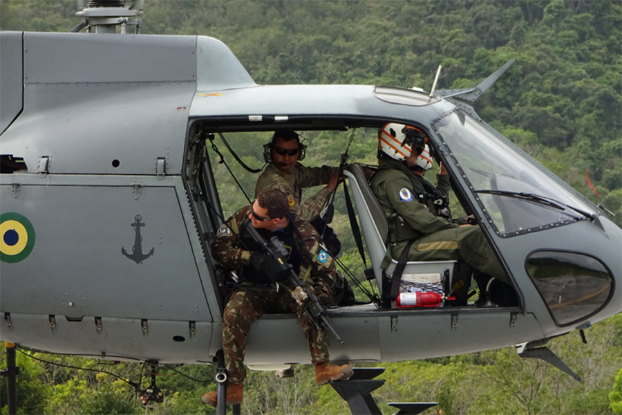 Figura 5 – “Militar do GRUMEC e Atirador do EB a bordo da aeronave Águia-87, UH-12, do EsdHU-1 da MB”
