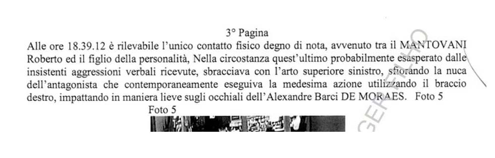 “Às 18h39, repara-se o único contato físico digno de nota, ocorrido entre Roberto Mantovani e o filho da personalidade. Nessa circunstância, esse último, provavelmente exasperado pelas agressões verbais recebidas, estendia o membro superior esquerdo, passando bem perto da nuca do antagonista, que, ao mesmo tempo, fazia a mesma ação utilizando o braço direito, impactando levemente os óculos de Alexandre Barci de Moraes”, conclui.