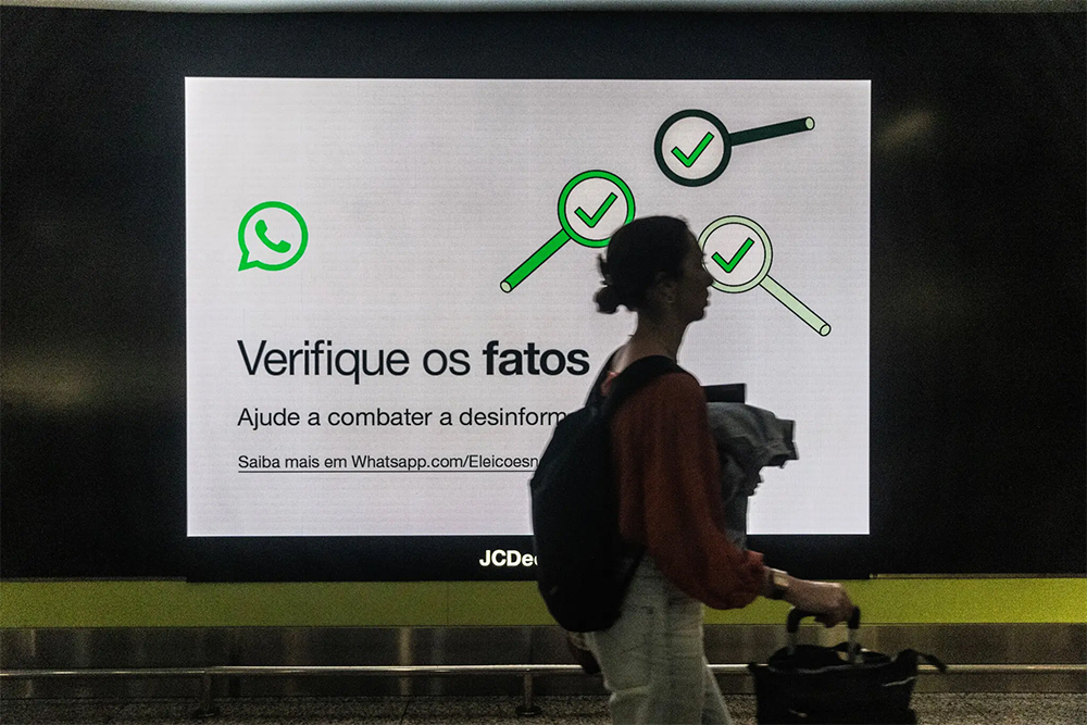 Uma mulher caminha diante de uma propaganda do WhatsApp no Aeroporto de Brasília pedindo às pessoas para “verificarem os fatos”. O Supremo Tribunal Federal tem procurado combater agressivamente a desinformação online.Credit…Dado Galdieri for The New York Times