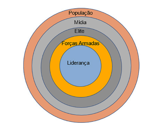 – Primeiro alvo – a Sociedade: os anéis são População, Mídia (Internacional e nacional), Elite Nacional, Forças Armadas/Polícia, e Liderança (Do anel mais externo para o mais interno). (“Guerras Hibridas | Geopolítica | Rússia”).