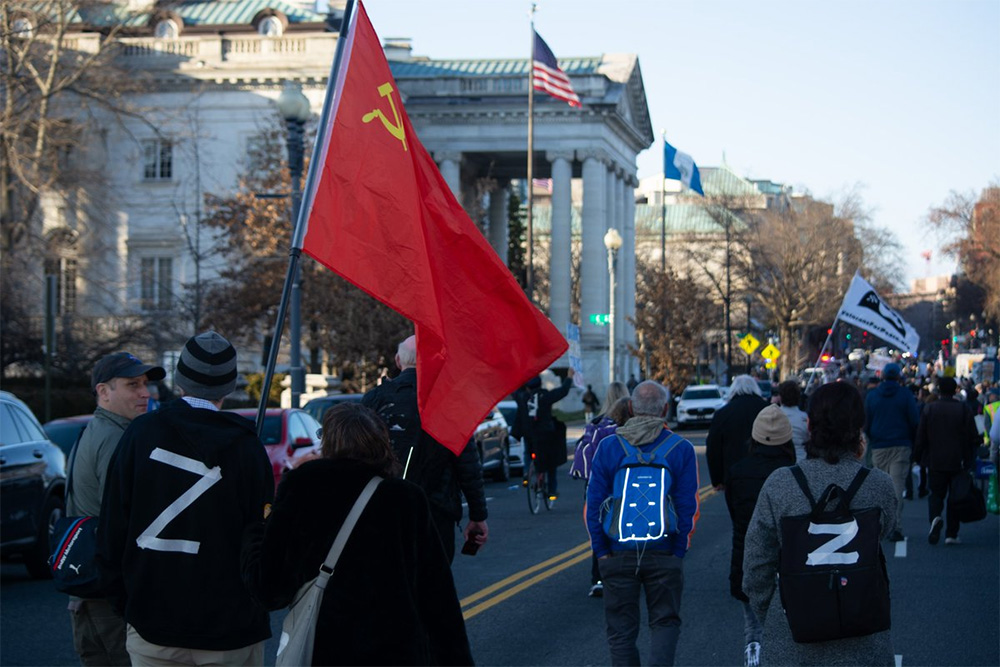 Sim leitor é o que a imagem mostra, ativistas de esquerda desfilando em Washington, carregando a bandeira da extinta União Soviética e nas roupas o símbolo da Operação Especial Russa na Ucrânia o “Z”.