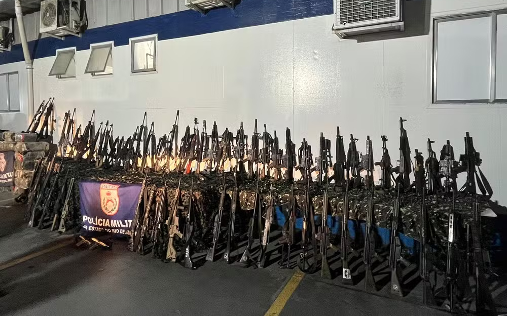 O delegado da Polícia Civil do Estado do Rio de Janeiro Vinicius Domingos publicou nas redes sociais imagens dos fuzis apreendidos durante a megaoperação considerada a mais letal da história do estado, realizada na terça-feira (28/10).