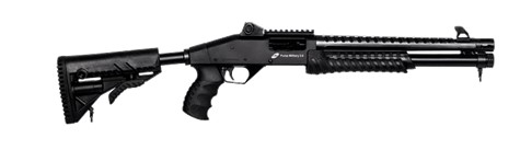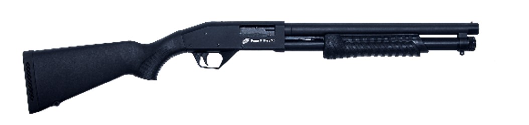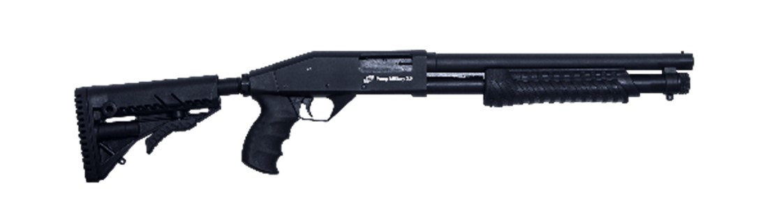 No calibre 12, possui cano 14”, sistema de funcionamento Pump Action, coronha retrátil em polipropileno, capacidade de 5+1 disparos e receptáculo em alumínio. Tem trava de segurança manual, suporte da bandoleira integrado à coronha, acabamento oxidado negro e Choke Cilíndrico. Seu peso é de 3 kg.