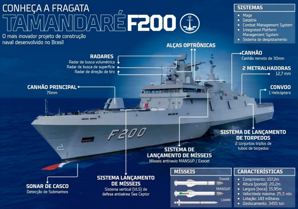 Primeira Fragata de um lote de quatro navios do Programa Fragatas Classe “Tamandaré” (PFCT), a F200 é resultado da parceria entre a MB e a Sociedade de Propósito Específico Águas Azuis, formada pela TKMS, Embraer Defesa e Segurança e Atech, sob gestão da Empresa Gerencial de Projetos Navais (EMGEPRON).