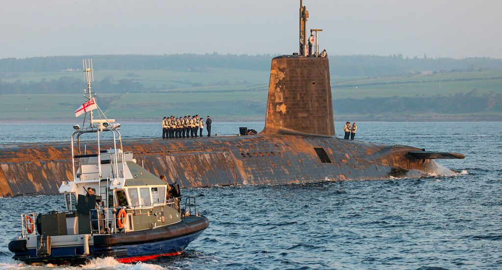 O submarino Nuclear da Classe Vanguard partiu de Faslane em março e quase igualou o recorde de patrulha da Marinha Real mais longa, um tempo extraordinário para a tripulação passar debaixo d’água. Este submarino foi substituído nos últimos dias por outro que partiu na semana passada após realizar um exercício de pré-patrulha. Se esse padrão continuar, sua tripulação não verá suas casas novamente até março de 2026.
