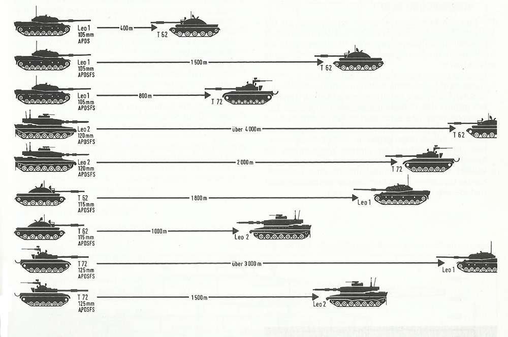 A figura abaixo mostra no cenário da Europa Central nos anos 80, o de Carros de Combate (MBT) das forças da OTAN e Pacto de Varsóvia . E as performances frente a cada modelo.