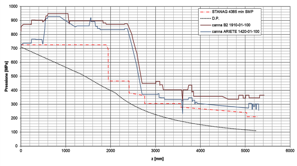 O canhão B2 centauro II, em vermelho linha contínua, mostra o ganho de mais de 20% na resistência interna do tubo frente ao do canhão do MBT Ariete, 120mm alma lisa .