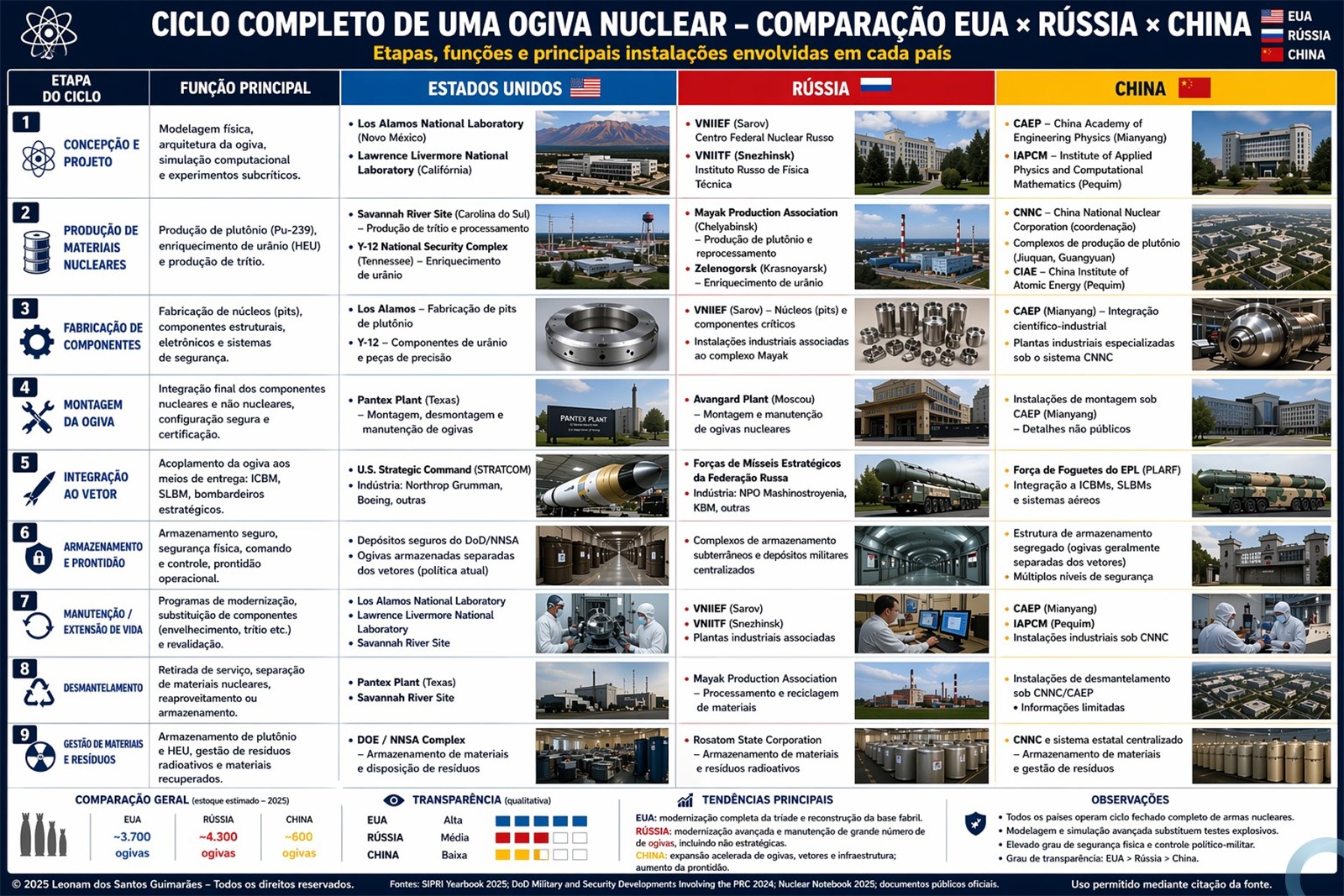 Ciclo Completo de uma Ogiva Nuclear – Comparação Estruturada (EUA x Rússia x China)