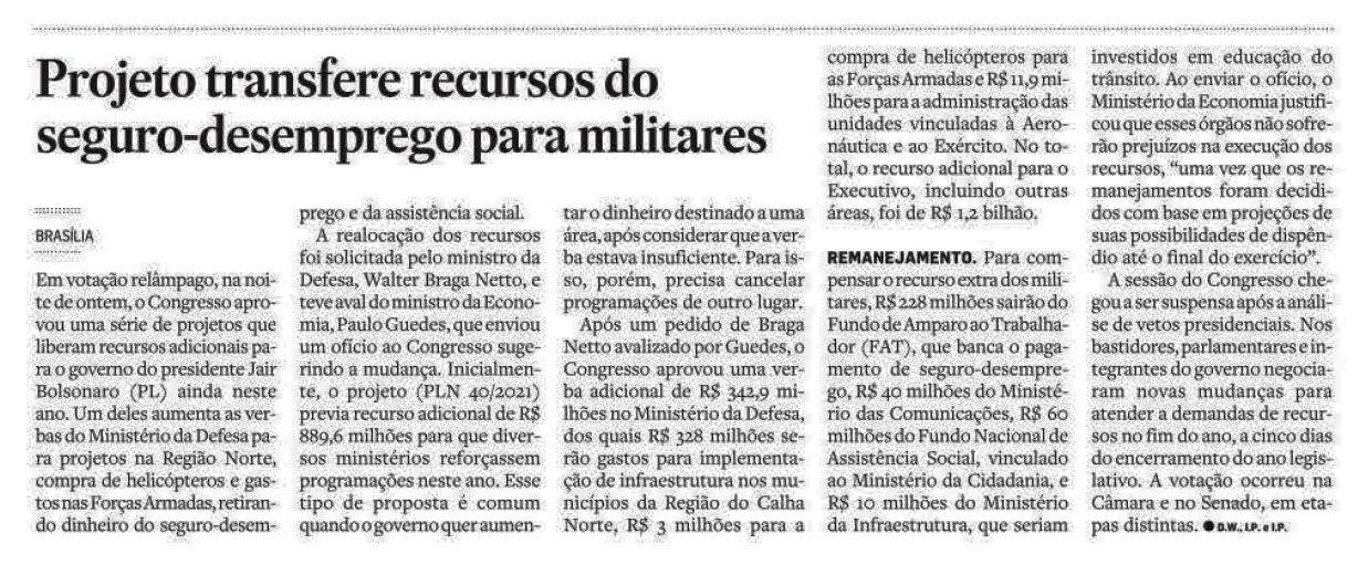 Publicou a nota "Congresso tira verba de seguro-desemprego para liberar compra de helicópteros para militares".  Matéria de autoria de Daniel Weterman, Iande Porcella e Izael Pereira.