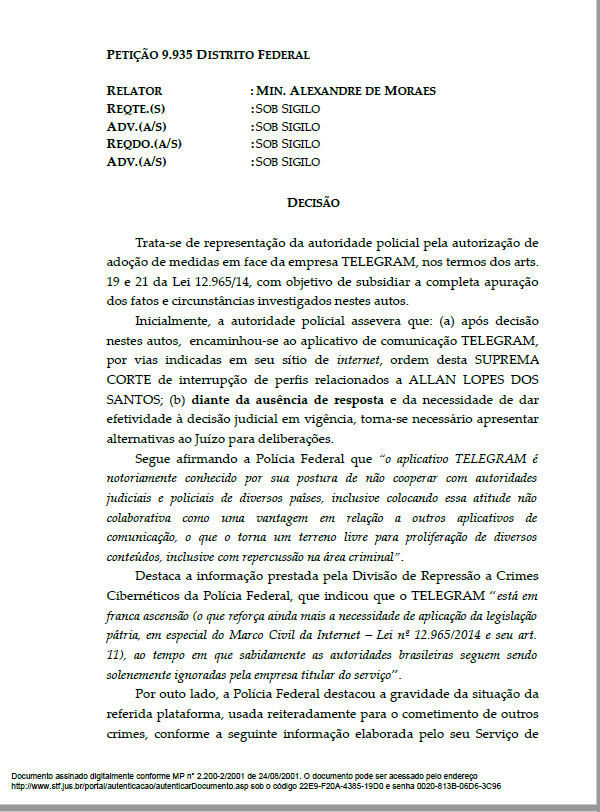 “O desprezo à Justiça e a falta total de cooperação da plataforma Telegram com os órgãos judiciais é fato que desrespeita a soberania de diversos países, não sendo circunstância que se verifica exclusivamente no Brasil e vem permitindo que essa plataforma venha sendo reiteradamente utilizada para a prática de inúmeras infrações penais”, disse o ministro.