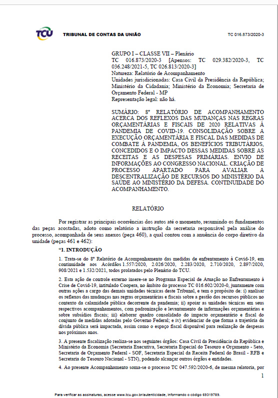 O Tribunal de Contas da União (TCU), sob a relatoria do ministro Bruno Dantas, aprovou o 8º Relatório de Acompanhamento com vistas a analisar os reflexos das mudanças nas regras orçamentárias e fiscais sobre a gestão dos recursos públicos, bem como os seus impactos sobre o orçamento federal e a sustentabilidade fiscal, em razão da crise da Covid-19.