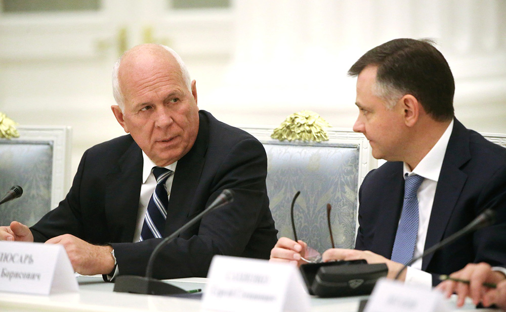 Rostec State Corporation Director General Sergei Chemezov and United Aircraft Corporation Director General Yury Slyusar, right, before a meeting with heads of defence industry enterprises. Photo: Konstantin Zavrazhin