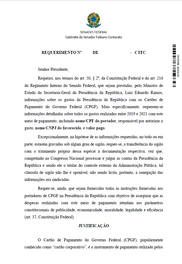 O autor do requerimento foi o senador Fabiano Contarato (PT-ES), que critica a falta de transparência do Poder Executivo com os gastos de cartão corporativo. Citando reportagens, o senador afirma que, no período entre 2019 e 2021, o Planalto desembolsou cerca de R$ 30 milhões – valor maior do que nos quatro anos anteriores. Apenas em 2021 foram R$ 11,8 milhões.