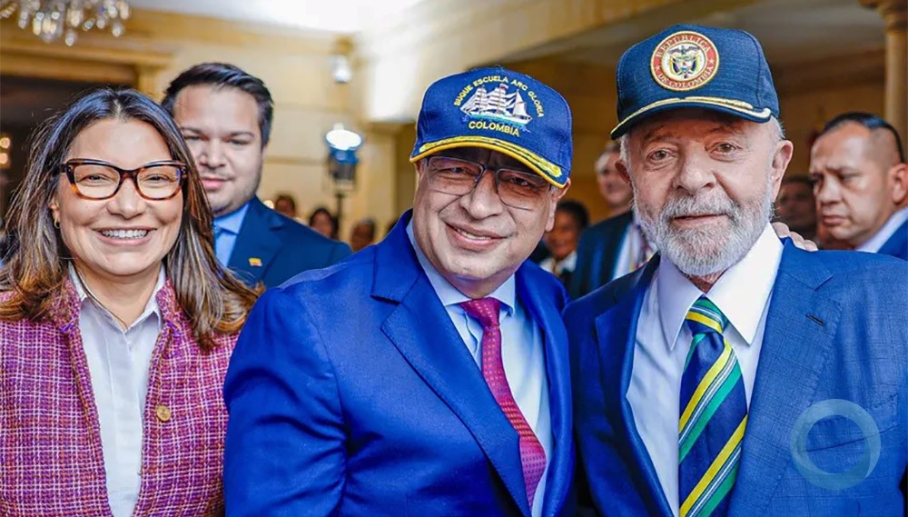 Na foto Janja Lula da Silva, Gustavo Petro e Lula da Silva, em 17ABR2024, no Palácio de Nariño em Bogotá.