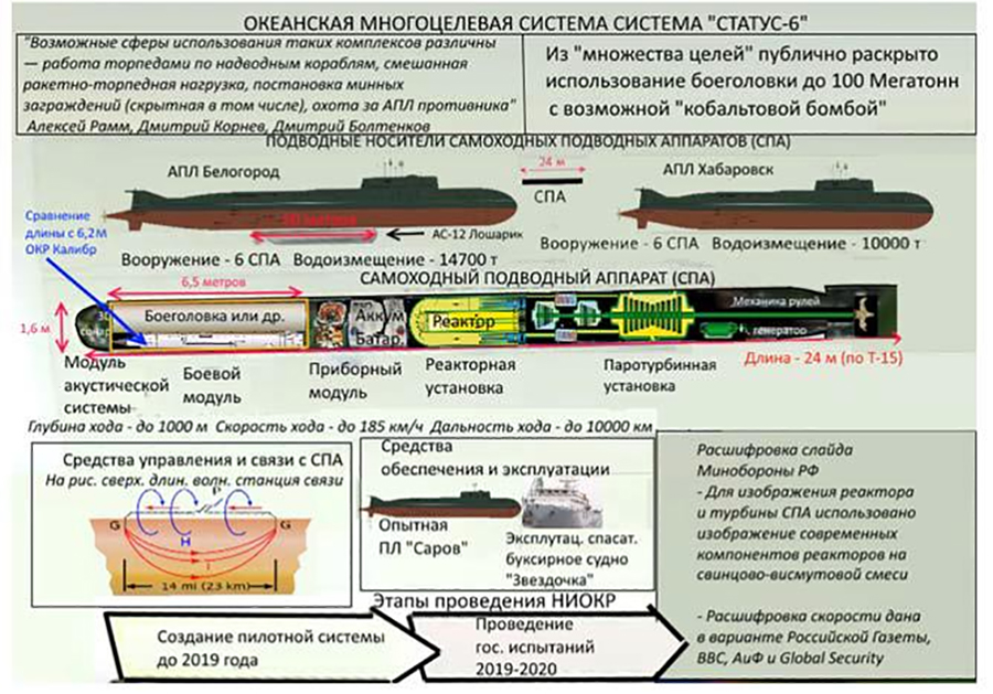 As menções à contaminação radioativa sugerem que o Poseidon possa ser dotado de uma bomba nuclear “suja”, funcionando como uma arma radiológica capaz de tornar inabitáveis vastos territórios litorâneos por meio de uma espécie de tsunami radioativo que inviabilizaria o uso militar e a atividade humana no litoral durante décadas.