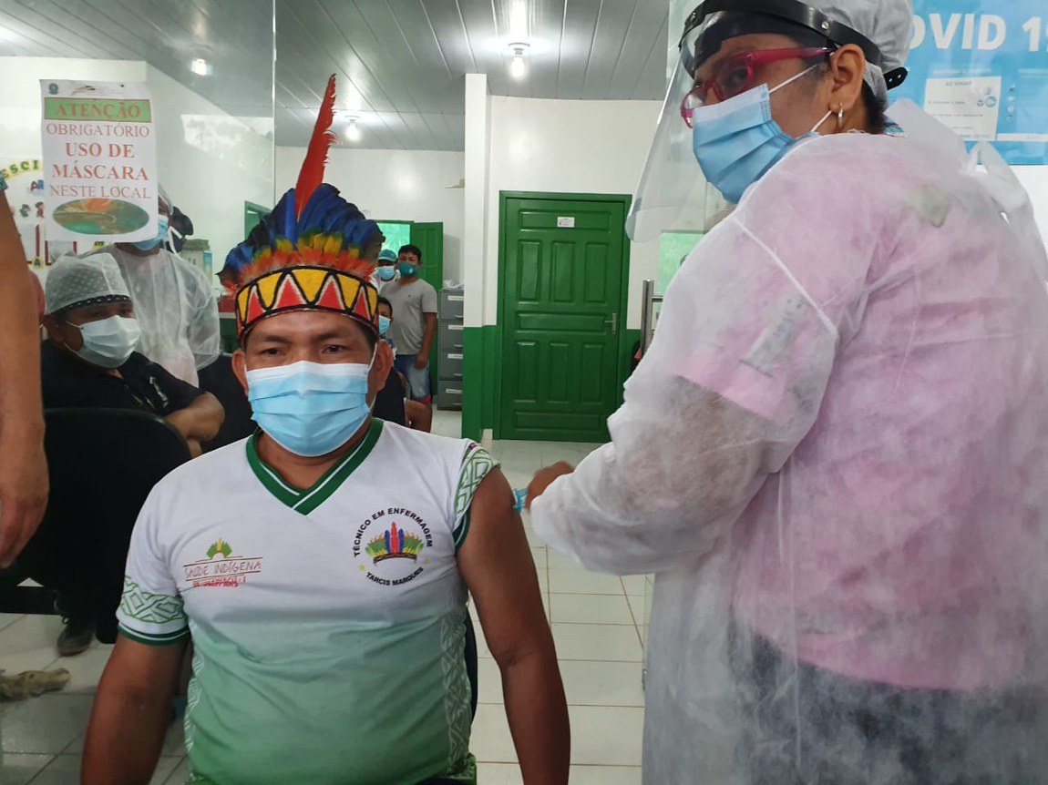 O técnico em enfermagem Tarcis Marques, 34 anos, foi o primeiro profissional de saúde a ser vacinado. Ele é da etnia kocama, mora na aldeia Umariaçu I e trabalha no polo base. “Estou dando exemplo para minha população. Quero que todos tomem a vacina para se prevenir contra essa doença, que é fatal”, disse ele, emocionado. Tarcis contou que foi infectado pela Covid-19, passou mal com problemas respiratórios, dores de garganta e de cabeça. “Me curei com remédios tradicionais aqui da região. Agora, chegou a vacina, que é muito importante, é nossa esperança”, completou.