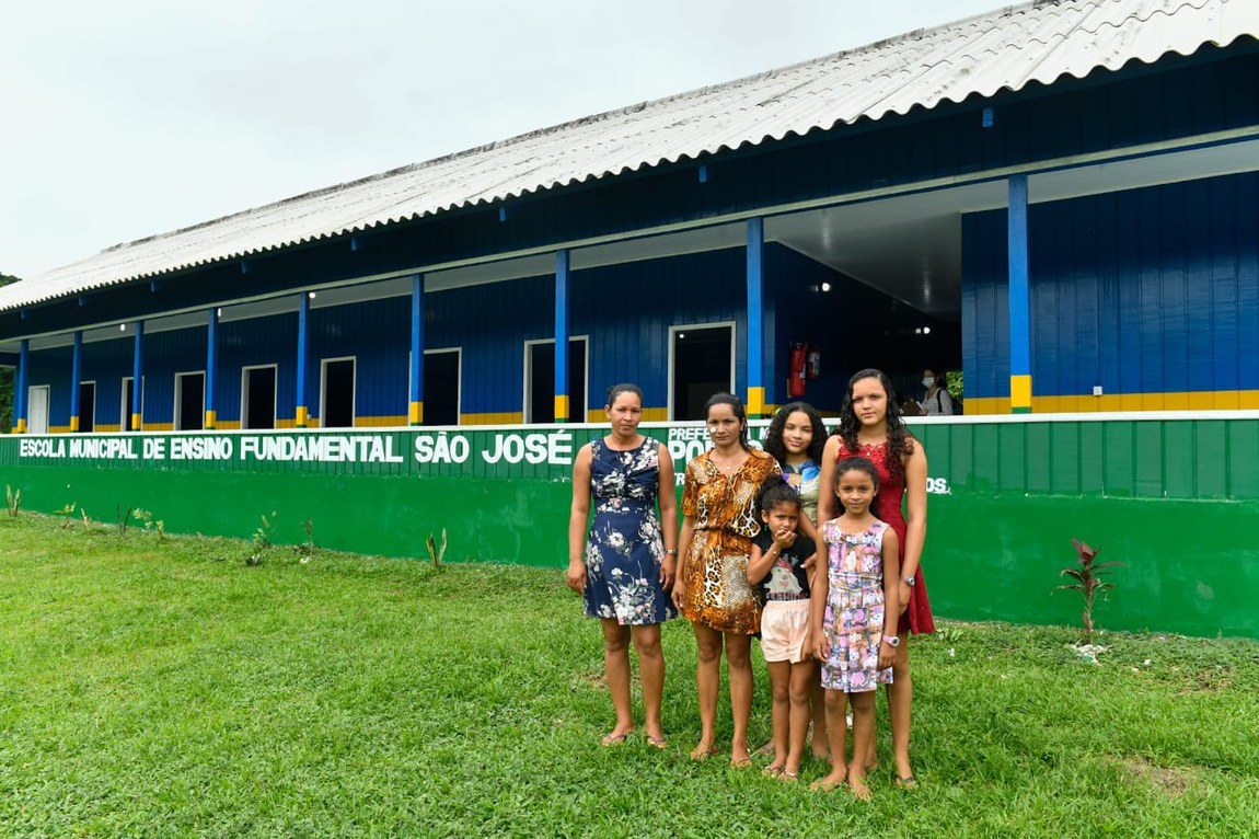 Após desembarcar do helicóptero, percorreram uma trilha para chegar ao local. A escola, que tem a faixada azul, já está pronta para iniciar o ano letivo de 2022. As aulas presenciais só começam no próximo ano, mas as expectativas para usar a nova instalação são grandes. A professora Eliana Antônia Ferreira da Silva, que ministra aulas de Português, Inglês e Religião, explica que a nova escola é mais ampla e será mais confortável para os estudantes. “Os alunos estão ansiosos para vir. A escola é importante para quem mora aqui e também para aqueles que estão em comunidades além do rio, e vem de canoa. Uma escola arrumada é mais um incentivo para virem para as aulas”, contou.