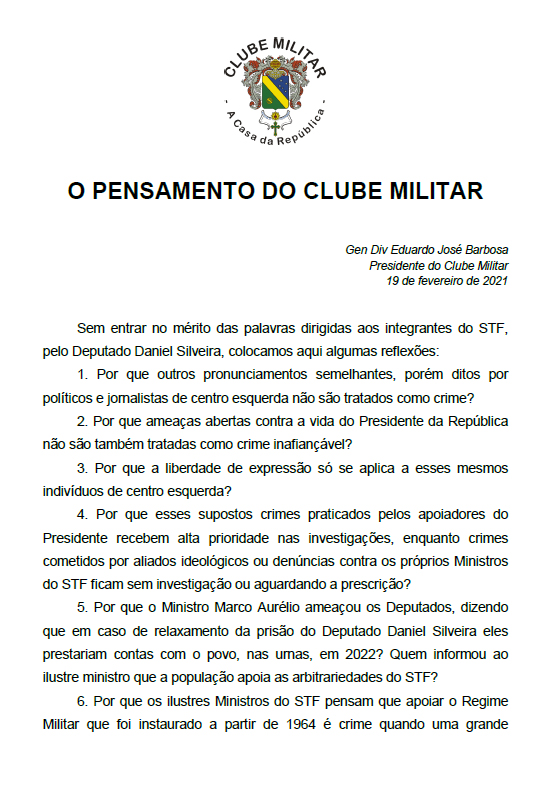 5. Por que o Ministro Marco Aurélio ameaçou os Deputados, dizendo que em caso de relaxamento da prisão do Deputado Daniel Silveira eles prestariam contas com o povo, nas urnas, em 2022? Quem informou ao ilustre ministro que a população apoia as arbitrariedades do STF?
