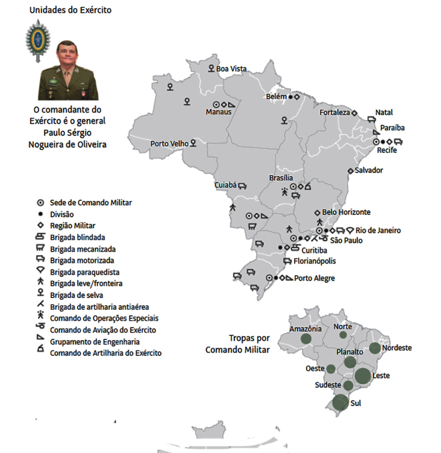 A distribuição das forças militares brasileiras pelo território concentra um número maior de tropas na região Sudeste