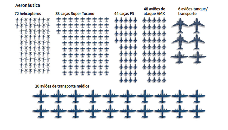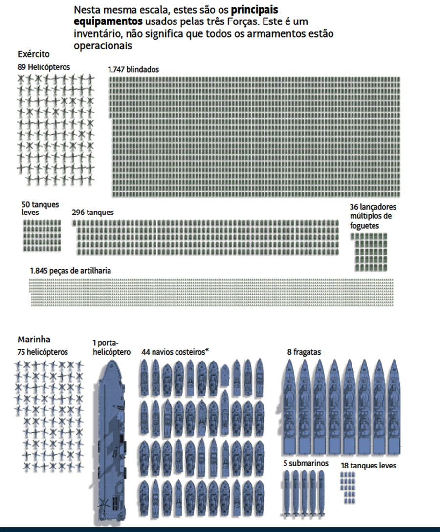 Em 2003, usando dados corrigidos do IISS (Instituto Internacional de Estudos Estratégicos, de Londres), o gasto militar brasileiro estava na casa de US$ 45 por habitante. Oito anos depois, eram US$ 175 —a maior parte, contudo, gasta com pensionistas e aposentados.
