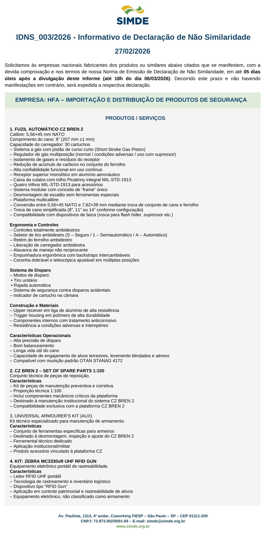 EMPRESA: HFA – IMPORTAÇÃO E DISTRIBUIÇÃO DE PRODUTOS DE SEGURANÇA