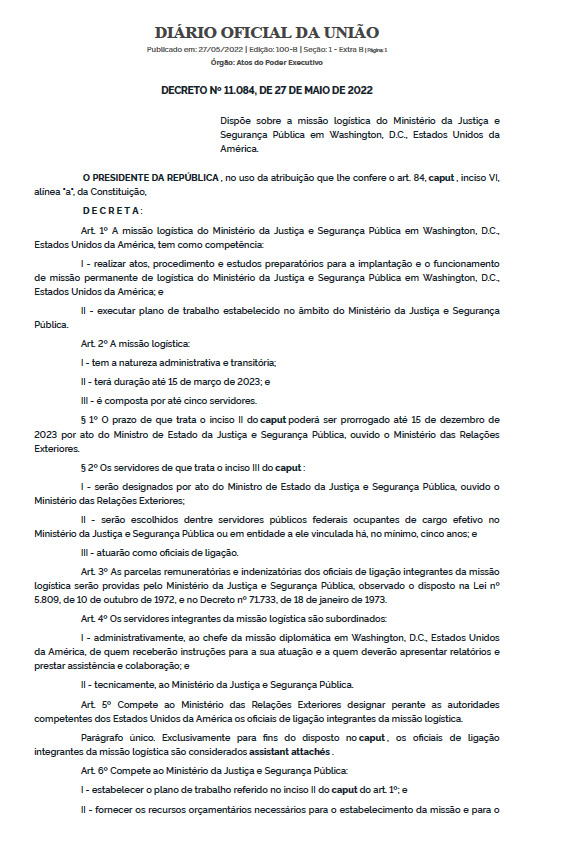 REPUDIAR a criação da “missão logística do Ministério da Justiça e Segurança Pública em Washington, D.C., Estados Unidos da América”, conforme DECRETO Nº 11.084, DE 27 DE MAIO DE 2022. (Nota DefesaNet – íntegra do Decreto nesta página)