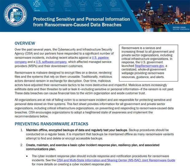 O documento em inglês possui quatro páginas e divide suas recomendações nas categorias de prevenção contra ataques, o gerenciamento de dados sensíveis e pessoais e formas de responder a brechas de segurança resultantes de ofensivas do tipo. “A CISA encoraja organizações a adotar um estado de maior consciência e implementar as recomendações”, afirma o guia.