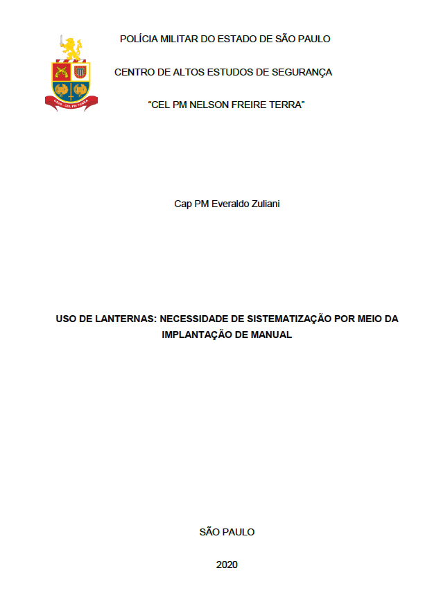 Nota DefesaNet Dissertação “USO DE LANTERNAS: NECESSIDADE DE SISTEMATIZAÇÃO POR MEIO DA IMPLANTAÇÃO DE MANUAL”, apresentada no Centro de Altos Estudos de Segurança como parte dos requisitos para a aprovação no Curso de Aperfeiçoamento de Oficiais pelo Cap PMESP Everaldo Zuliani. O Editor |