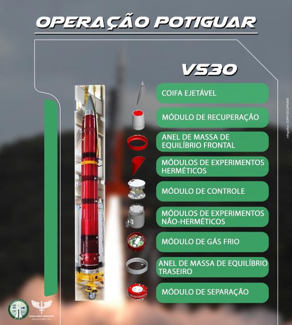 De acordo com o coordenador da Operação Potiguar, Tenente-Coronel Engenheiro Fernando César Monteiro Tavares, o VS30 cumpre missões de microgravidade com cargas úteis na faixa de 260 kg a 330 kg e altitude máxima de 120 km a 160 km. “Esses foguetes são utilizados para experimentos científicos e tecnológicos voltados às indústrias de fármacos, metalurgia, semicondutores, alimentos e muitas outras”, destaca.