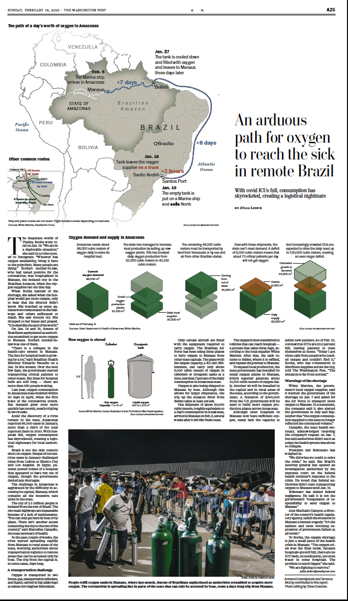 In the past couple of weeks, the virus started spreading rapidly from Manaus to rural areas of the state, worrying authorities about transportation logistics to remote areas that can be accessed only by boat. The trip from the capital is,in some cases, days long. A transportation challenge Oxygen is transported in two forms: gas, transported in cylinders, and liquid, carried in big tanks kept at minus-300 degrees Fahrenheit