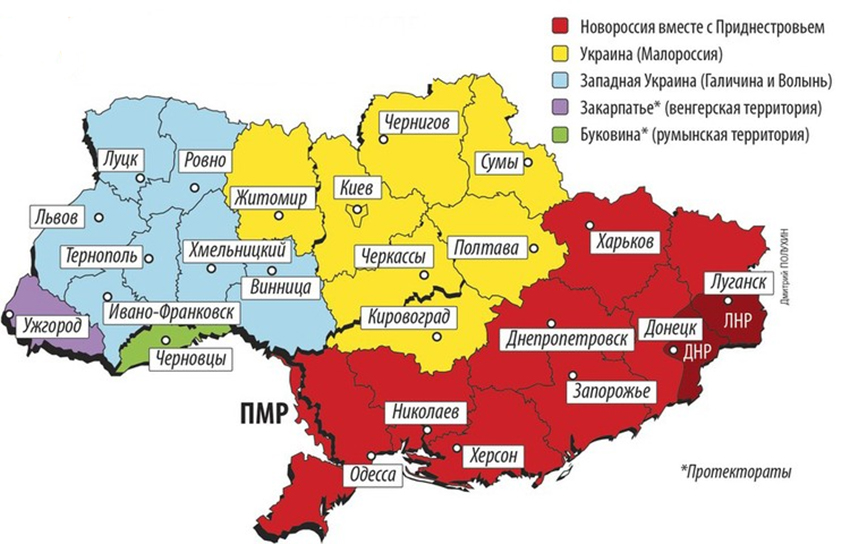 O Komsolmolskaya Pravda publicou um “debate” entre um jornalista e um “cientista político” mostrando três cenários possíveis para a Ucrânia: 1. Plano otimista: a Ucrânia permanece em seu tamanho atual (menos os territórios do DPR e LPR dentro de seus limites administrativos). Para isso, a Ucrânia teria que: a. reconhece oficialmente a Crimeia como território russo e a independência do Donbass; b. introduzir na constituição uma cláusula de neutralidade e não alinhamento; c. a renúncia às armas nucleares; d. extraditar criminosos de guerra a pedido do Comitê de Investigação da Federação Russa; e. fixa a posição do idioma russo como o segundo idioma do estado. 2. Plano realista: dividir a Ucrânia em várias partes Criar várias repúblicas formalmente independentes semelhantes à DPR e LPR, com base nas regiões predominantemente de língua russa das históricas Slobozhanshchina e Novorossiya – Kharkiv People, Dnepropetrovsk, Zaporozhye, Kherson, Nikolaev e Odessa Na segunda etapa, no congresso de unificação de representantes do povo, eles, juntamente com o DPR e LPR, bem como Pridnestrovie, que se juntará a eles, podem declarar a criação de um novo estado independente que está em estreitas relações aliadas com a Federação Russa – Novorossiya. |