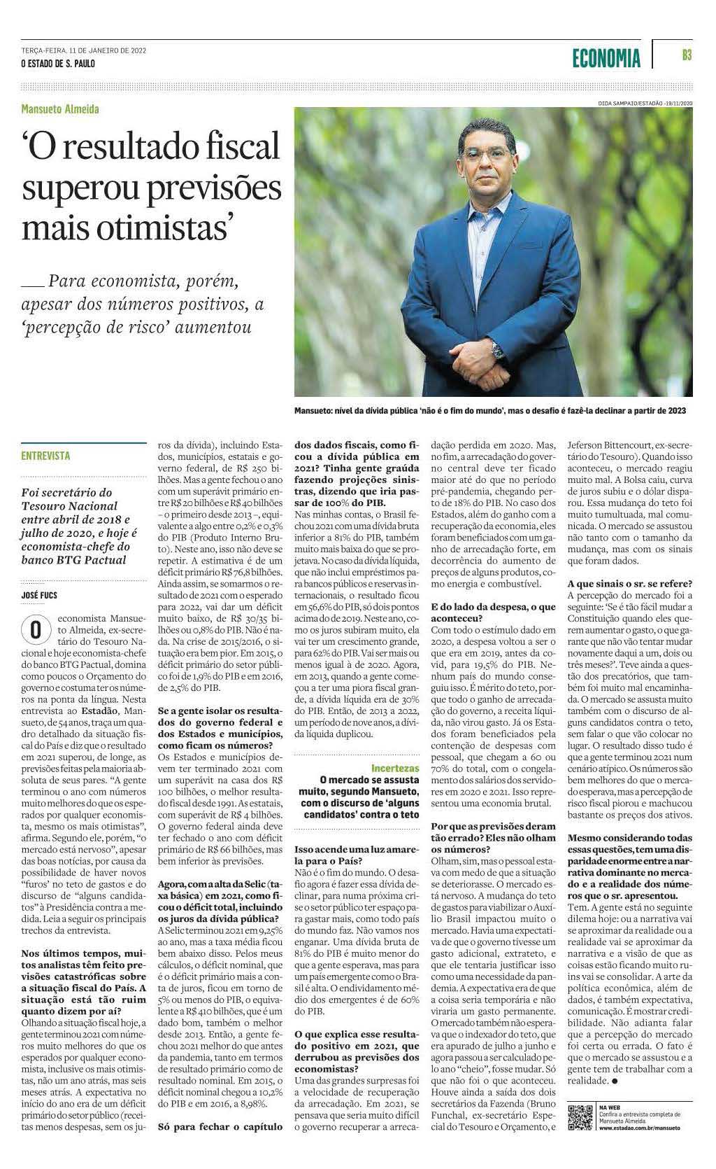 Nesta entrevista ao Estadão, ele traça um quadro detalhado da situação fiscal do País e diz que o resultado das contas governamentais em 2021 superou, de longe, as previsões catastrofistas feitas pela maioria absoluta de seus pares. “A gente terminou 2021 com números muito melhores do que os esperados por qualquer economista, inclusive os mais otimistas, não um ano atrás, mas seis meses atrás”, afirma.