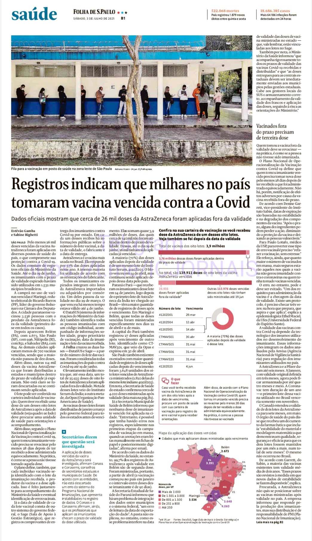 Na última sexta-feira, dia 2 de julho, a Folha de São Paulo (Veja imagem da capa) publicou uma reportagem dizendo que 26 mil doses da vacina AstraZeneca haviam sido aplicadas após o vencimento em 1532 municípios. Não era verdade. A informação não foi corrigida até agora e o caso virou mais um de barraco e ataques nas redes. O que aconteceu com o jornalismo?