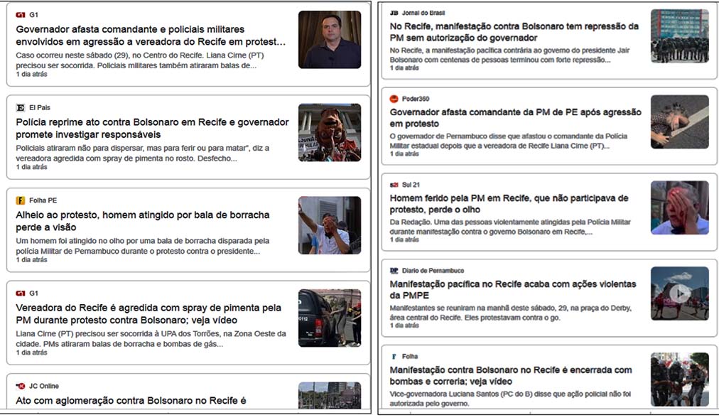 Matéria do portal G1 que diz que vereadora é agredida pela PM. Disponível em https://g1.globo.com/pe/pernambuco/noticia/2021/05/29/vereadora-do-recife-e-atingida-com-spray-de-pimenta-pela-pm-durante-protesto-contra-bolsonaro-veja-video.ghtml