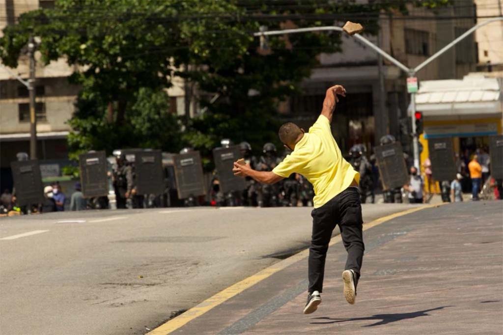 Manifestante atira pedras na tropa de choque da PMPE. Foto: Felipe Ribeiro/JC. Disponível em:https://portaldeprefeitura.com.br/2021/05/29/imagens-registram-momento-em-que-pedras-e-diversos-objetos-sao-atirados-contra-tropa-da-pm-em-ato-no-recife/