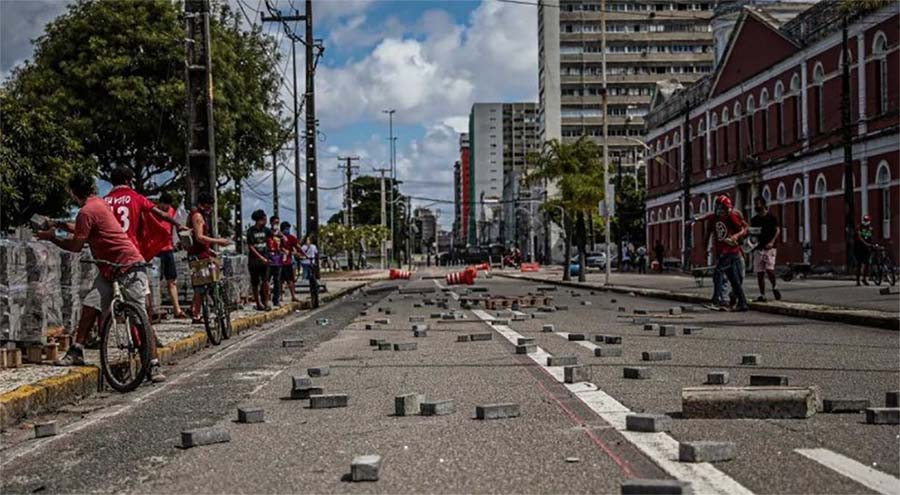 Pedras atiradas na PMPE. Foto: Felipe Ribeiro/JC. Disponível em:https://portaldeprefeitura.com.br/2021/05/29/imagens-registram-momento-em-que-pedras-e-diversos-objetos-sao-atirados-contra-tropa-da-pm-em-ato-no-recife/