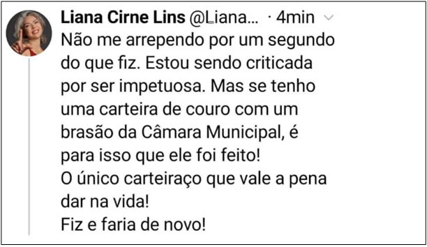 A maior estranheza foi a atitude e a veiculação do ato de uma vereadora do Recife, Liana Cirne, a qual tentou dar uma “carteirada” e impedindo o movimento da viatura dos policiais que estavam tentando restabelecer a ordem pública naquela localidade. A soberba da vereadora não parou no ato e continuou após o ato em suas redes sociais, conforme atesta as imagens abaixo.