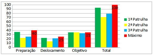 A avaliação de Patrulha ocorreu durante a execução de três missões, divididas em três fases: Preparação, Deslocamento e Ação no Objetivo, somando 20 indicadores. A média do desempenho nas três fases foi de 93% para a primeira Patrulha, 71% para a segunda e 79% para a terceira, perfazendo uma média global de 81%.