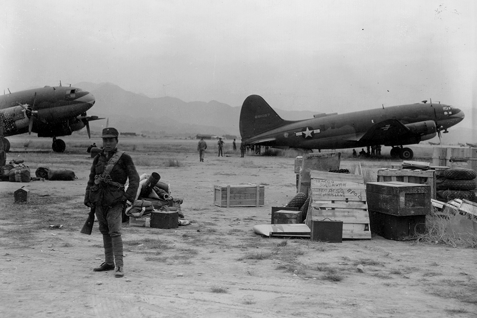 | O C-46 tinha capacidade de transportar grandes quantidades de suprimentos para aeródromos remotos e despreparados como este, "em algum lugar na China". (Arquivo Nacional) |