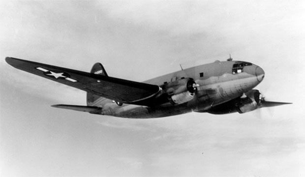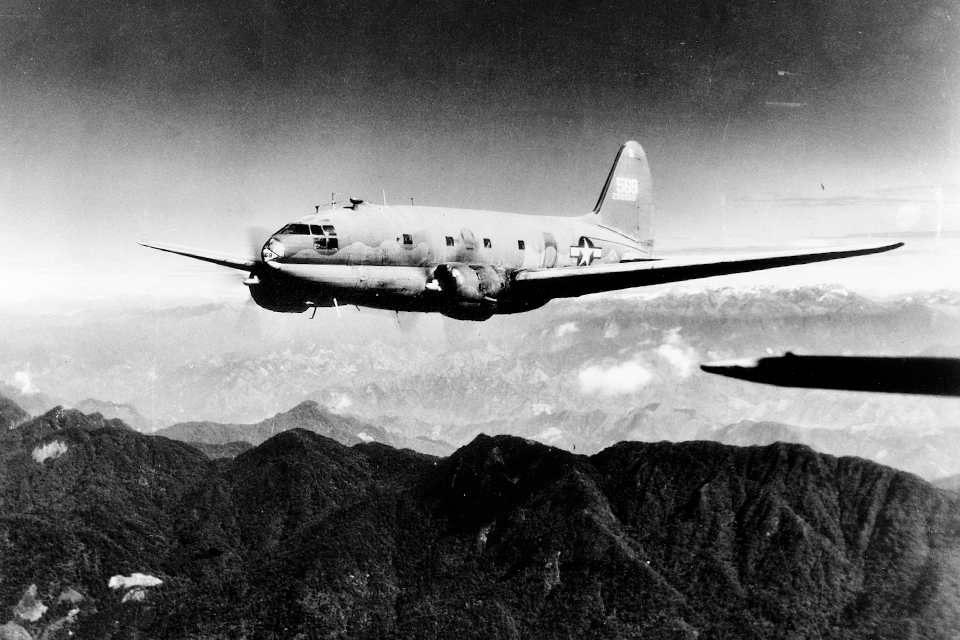 | Um C-46 enfrenta seu desafio mais famoso, a rota "Hump" pelo Himalaia entre a Índia e a China. (Arquivo Nacional) |